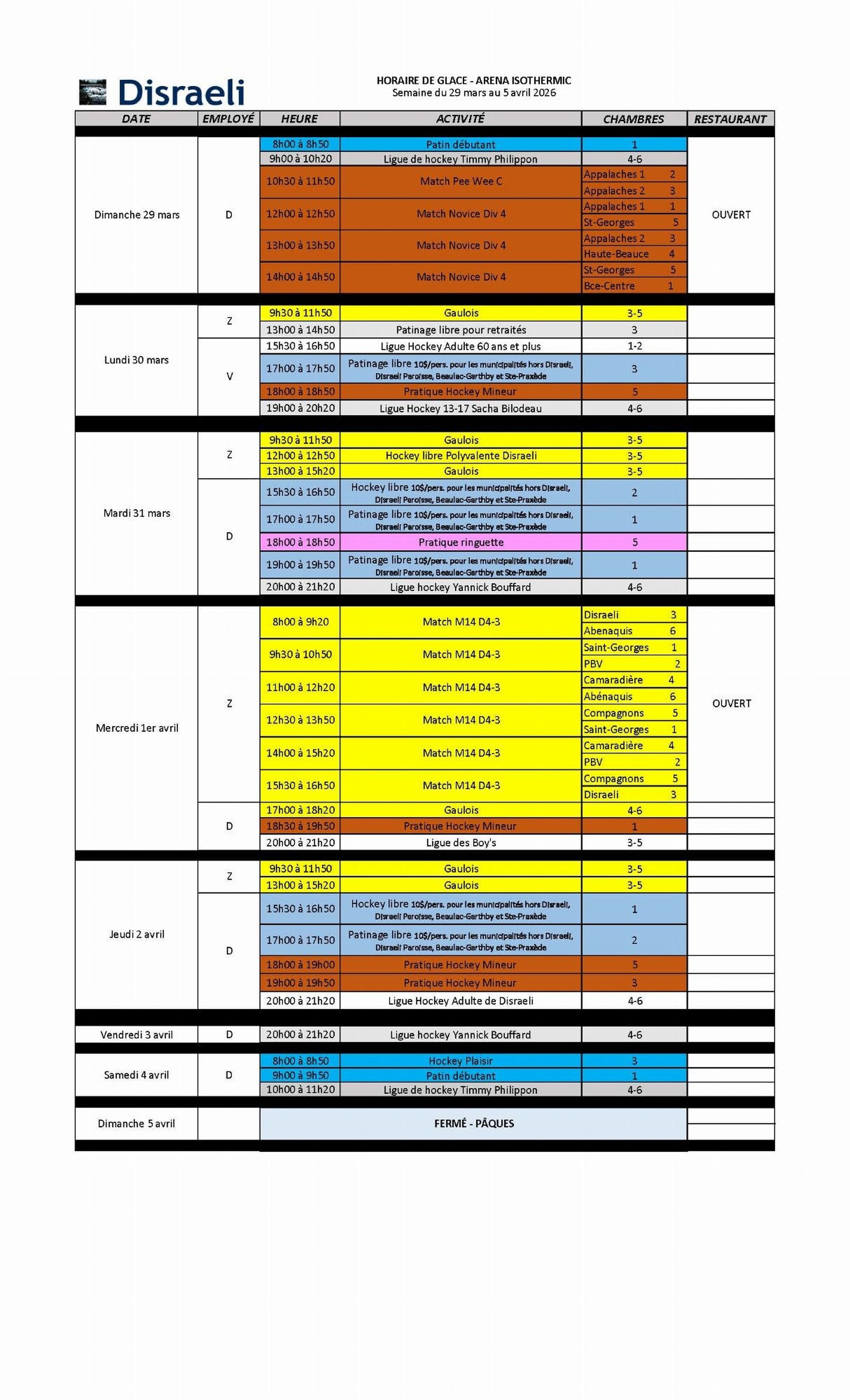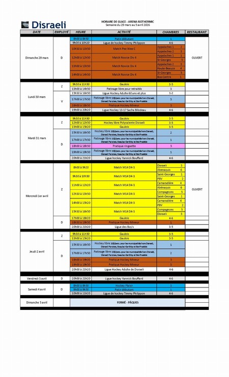 Horaire du 29 mars au 5 avril